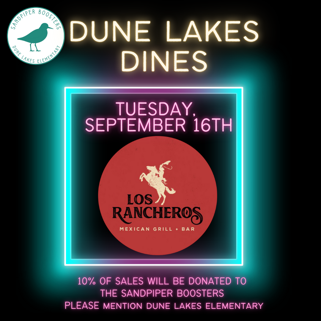 10% of all sales from 3P-9P will be donated to the Sandpiper Boosters. This is for take-out, dine-in or delivery! Please mention Dune Lakes Elementary.